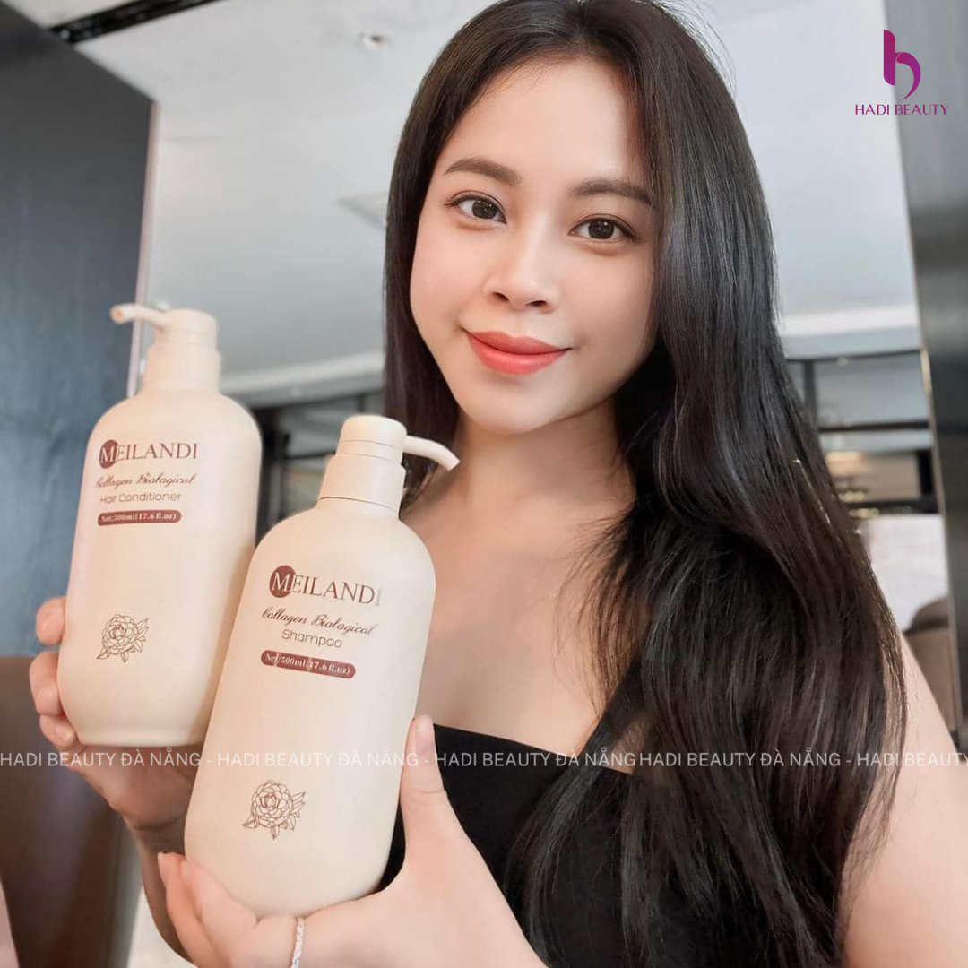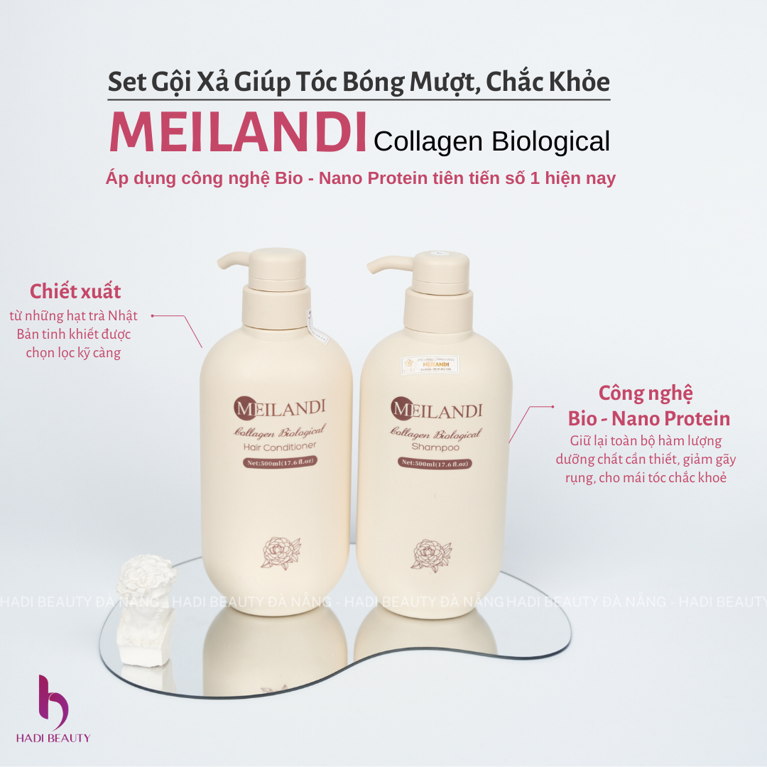 Set Gội Xả Meilandi Collagen Biological Shampoo & Conditioner là một dòng sản phẩm chăm sóc tóc của thương hiệu Meilandi. Sản phẩm này cung cấp các dưỡng chất từ thiên nhiên giúp mái tóc khô xơ, hư tổn trở nên mềm mượt và bóng khỏe hơn. Ngoài ra, bộ gội xả này còn ngăn ngừa rụng tóc do sử dụng hóa chất uốn nhuộm và tác hại từ máy sấy nhiệt độ cao, hiện đang rất được sử dụng tại rất nhiều salon. Với độ pH thấp nằm trong khoảng 5 - 6.5, chứa ít thành phần Sunfat nên không làm ảnh hưởng đến làn da đầu của bạn. Đặc biệt, bộ dầu gội này sở hữu hương thơm nhẹ nhàng, dịu nhẹ, có thể giữ mùi được từ 1-2 ngày, khiến bạn cảm thấy rất dễ chịu và thư giãn.