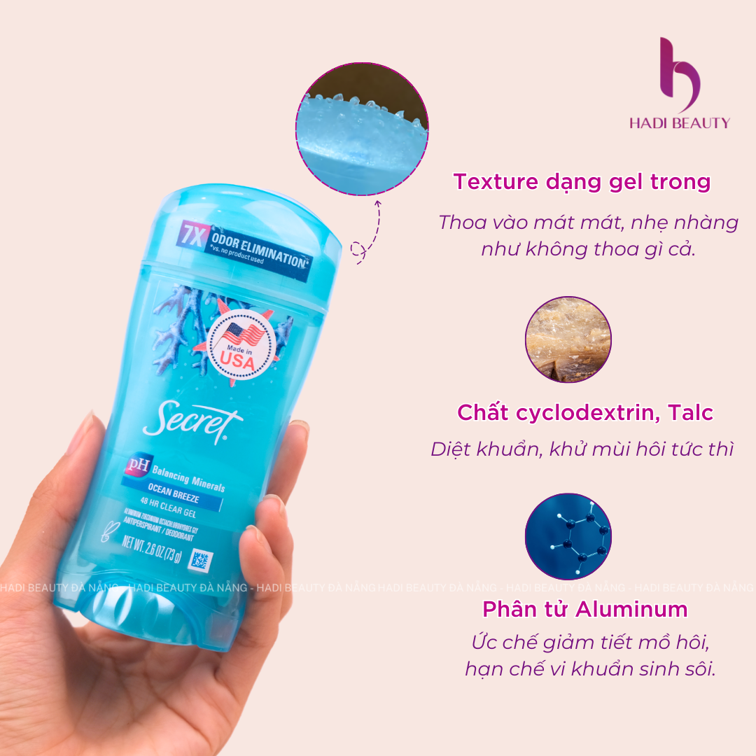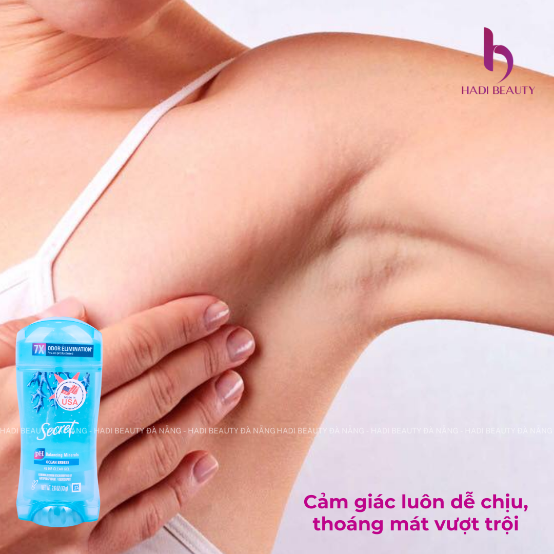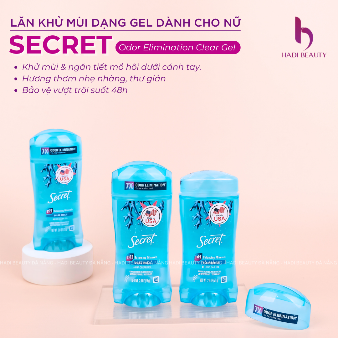 - Gel khử mùi Secret Clear Gel dành cho các bạn nữ với công dụng chính là khử mùi & ngăn tiết mồ hôi dưới cánh tay. - Loại gel trong này thoa vào mát mát, cảm giác nhẹ nhàng như không thoa gì cả. - Gel thấm, khô nhanh, không để lại vết hằn, không gây tác dụng phụ hay bị ố quần áo. - Hiệu quả ngăn khử mùi vượt trội cả ngày, cảm giác rất khô thoáng, không gây dị ứng.