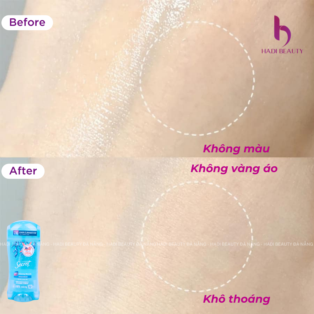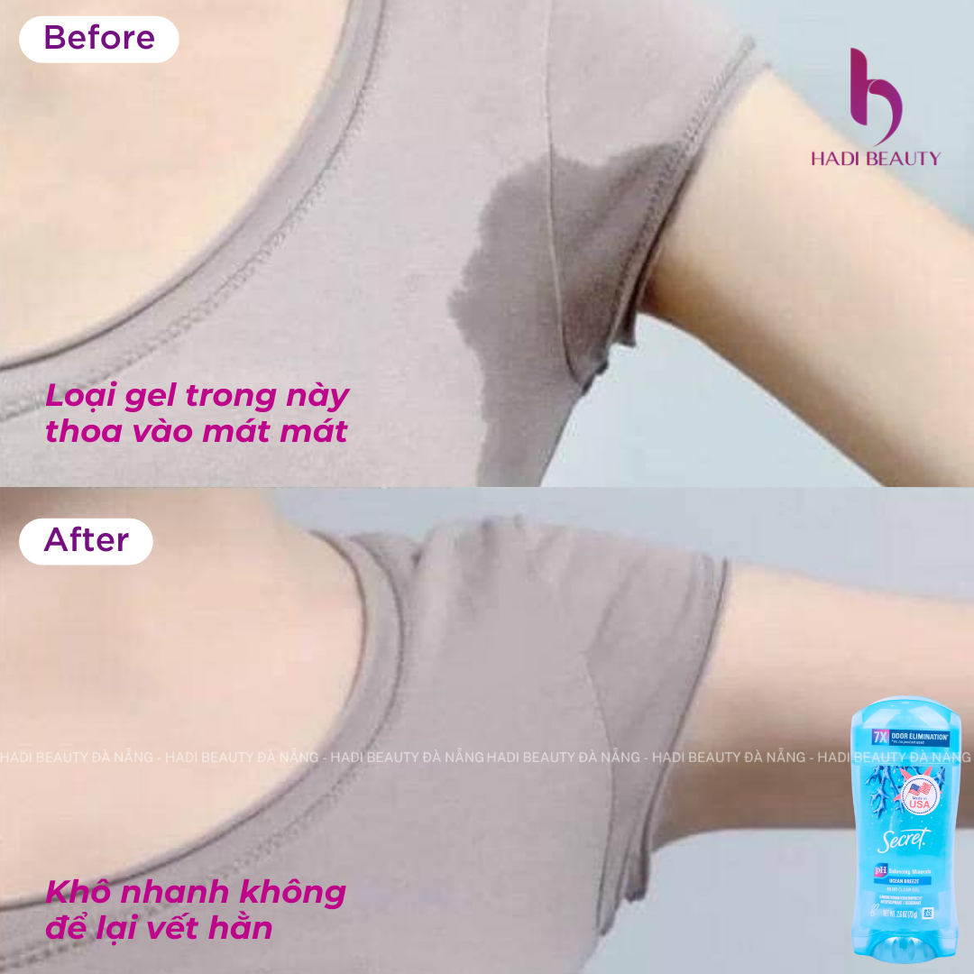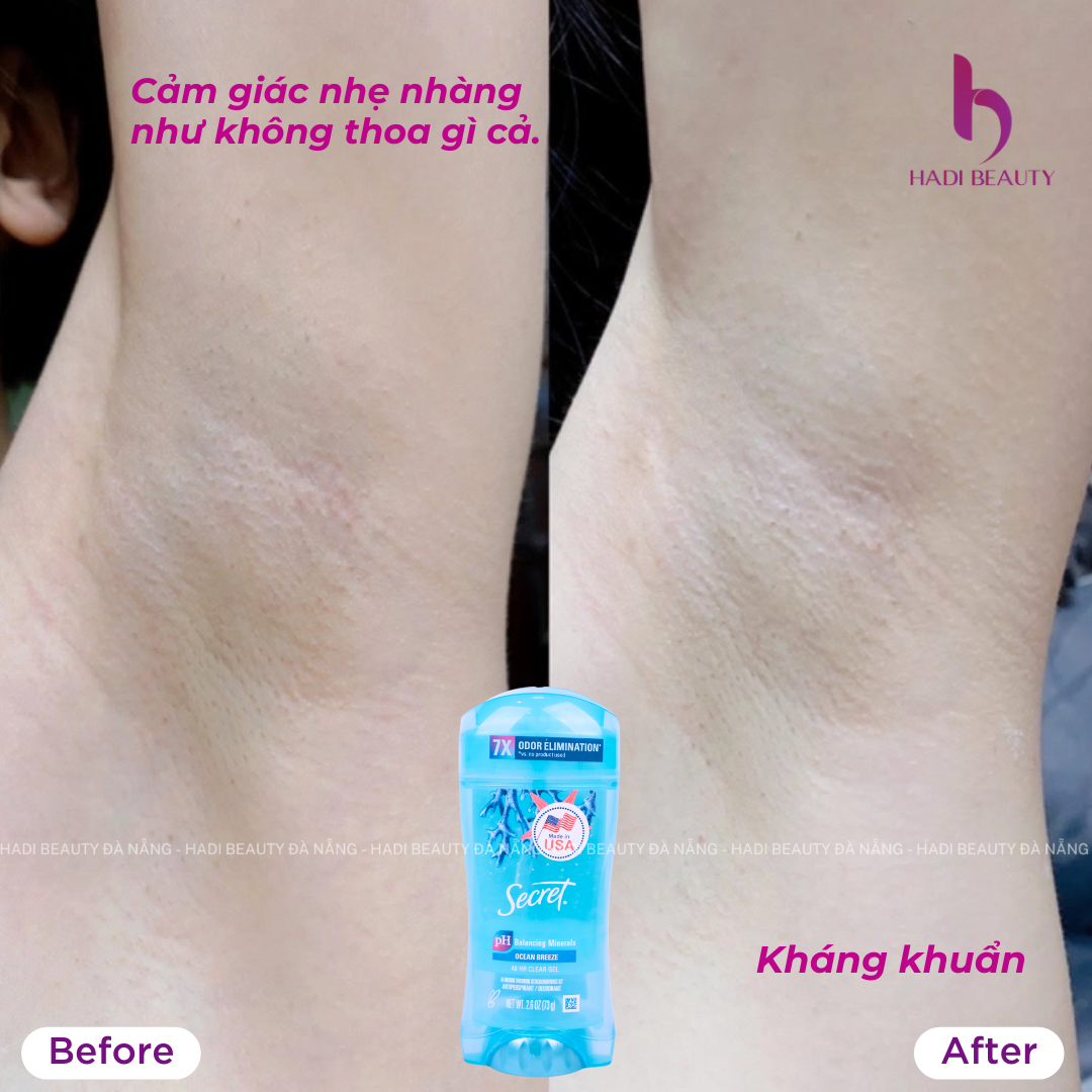 - Gel khử mùi Secret Clear Gel dành cho các bạn nữ với công dụng chính là khử mùi & ngăn tiết mồ hôi dưới cánh tay. - Loại gel trong này thoa vào mát mát, cảm giác nhẹ nhàng như không thoa gì cả. - Gel thấm, khô nhanh, không để lại vết hằn, không gây tác dụng phụ hay bị ố quần áo. - Hiệu quả ngăn khử mùi vượt trội cả ngày, cảm giác rất khô thoáng, không gây dị ứng.