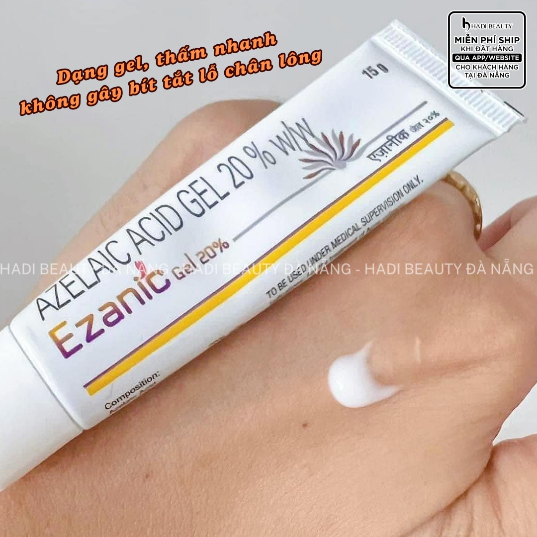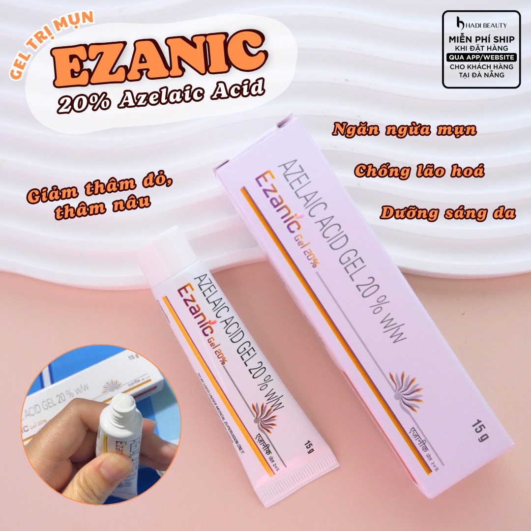 Với thành phần chính là Acid Azelaic - một loại acid dicarboxylic có nguồn gốc tự nhiên, có mặt trong nhiều sản phẩm trị mụn nhờ đặc tính kháng khuẩn, chống viêm, Ezanic Gel 20% là sản phẩm có tác dụng làm giảm tình trạng mụn từ nhẹ đến vừa như mụn ẩn, mụn trứng cá, mụn đầu đen, mụn viêm
