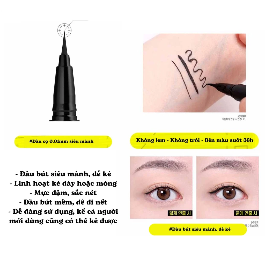 - Bút Kẻ Mắt Nước Siêu Sắc Mảnh, Không Lem Trôi Maybelline New York Hyper Sharp Liner Extreme hiện đã có tại Thế giới Skinfood có những đặc trưng nổi bật như sau: - Đầu cọ cải tiến, sắc nét với chỉ 0.01mm - Nét vẽ mềm mại giúp cho thao tác khi kẻ linh hoạt và dễ dàng hơn - Dễ dàng thao tác nét vẽ từ mảnh, mỏng tự nhiên đến nét dày, cá tính - Với công nghệ màn phim độc đáo giúp kẻ mắt không lem, không trôi suốt 17 giờ liền .- Công nghệ Ink Capsule Mới giúp dòng mực đều hơn 147% và đậm nét hơn so với phiên bản cũ.