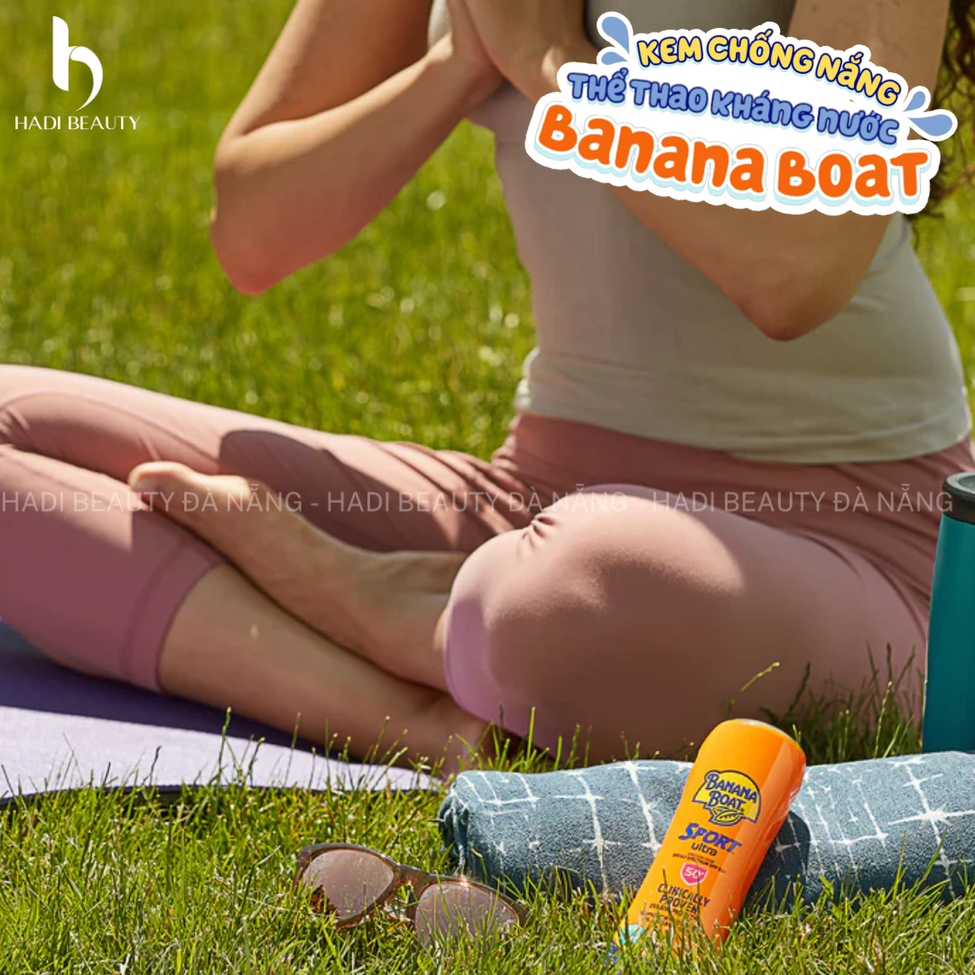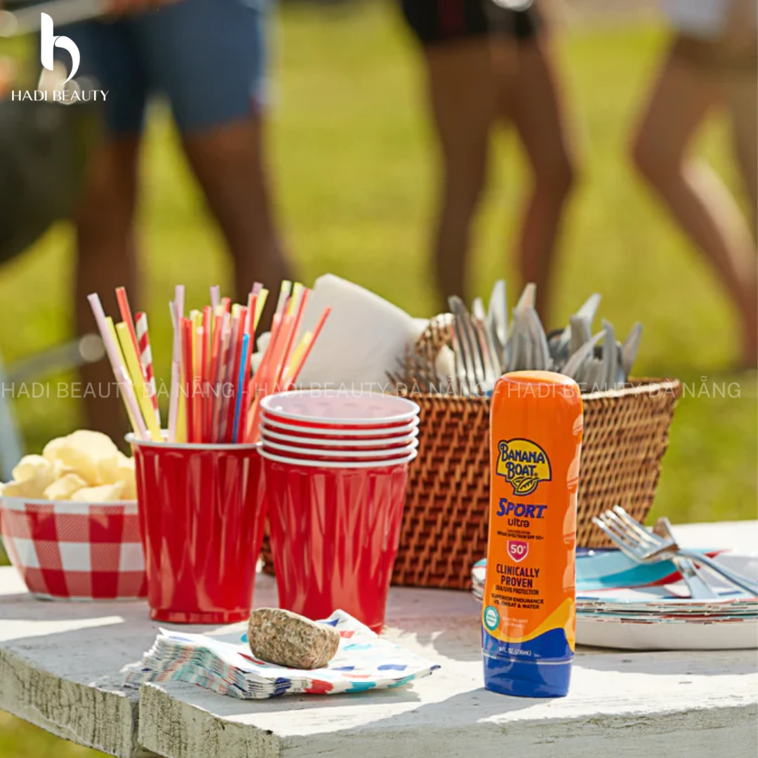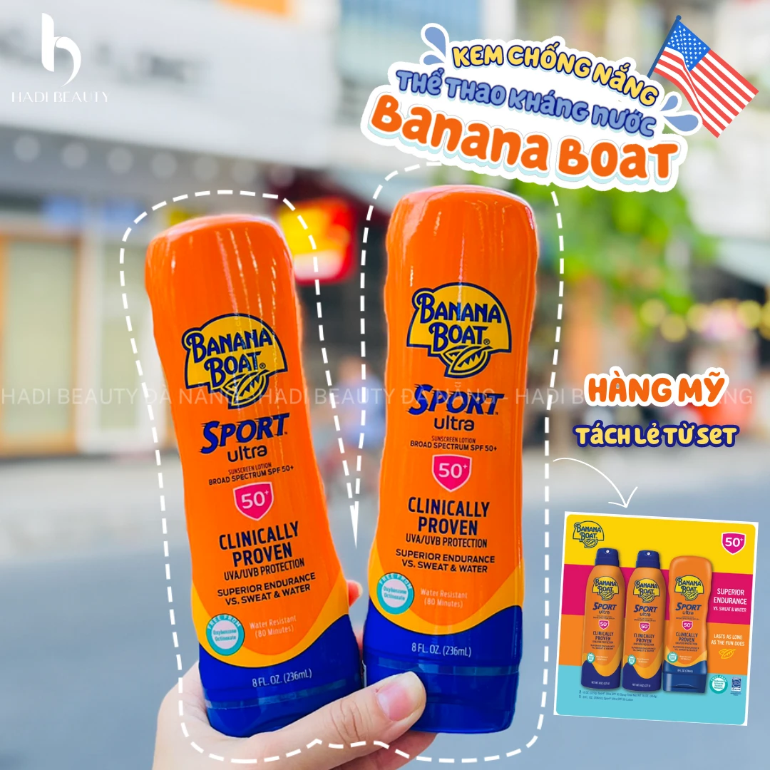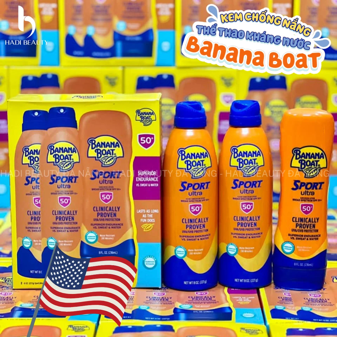 - Kem Chống Nắng Banana Boat Ultra Sport Sunscreen Lotion SPF50+ là loại kem chống nắng được hãng sản xuất dành riêng cho những người yêu thể thao, vận động ngoài trời dễ đổ mồ hôi nên chắc chắn yên tâm về độ chống nắng và độ chống nước cực tốt. Với SPF 50 cùng lớp kem dạng lotion không đặc như kem cũng không lỏng như nước giúp thẩm thấu nhanh vào da tạo lớp màng bảo vệ da khỏi các tia UVA/UVB ( là những tia cực tím gây ung thư da, nám, lão hoá, cháy nắng và sạm da,...)