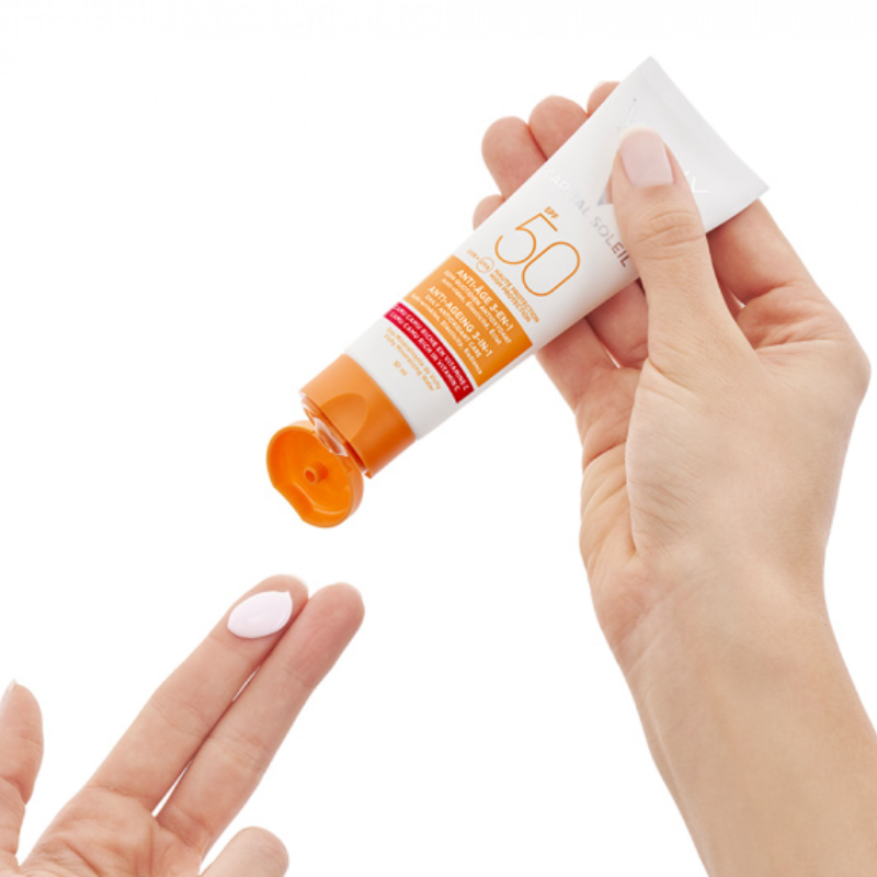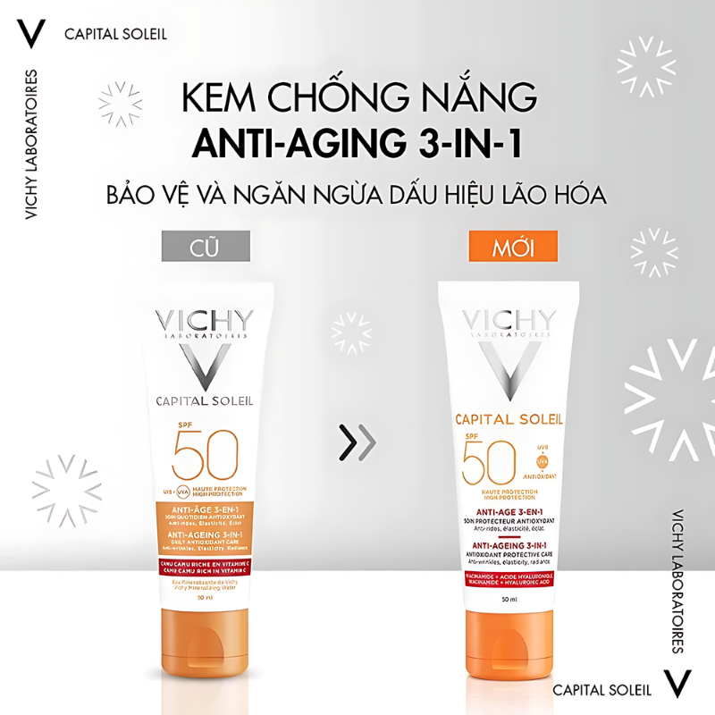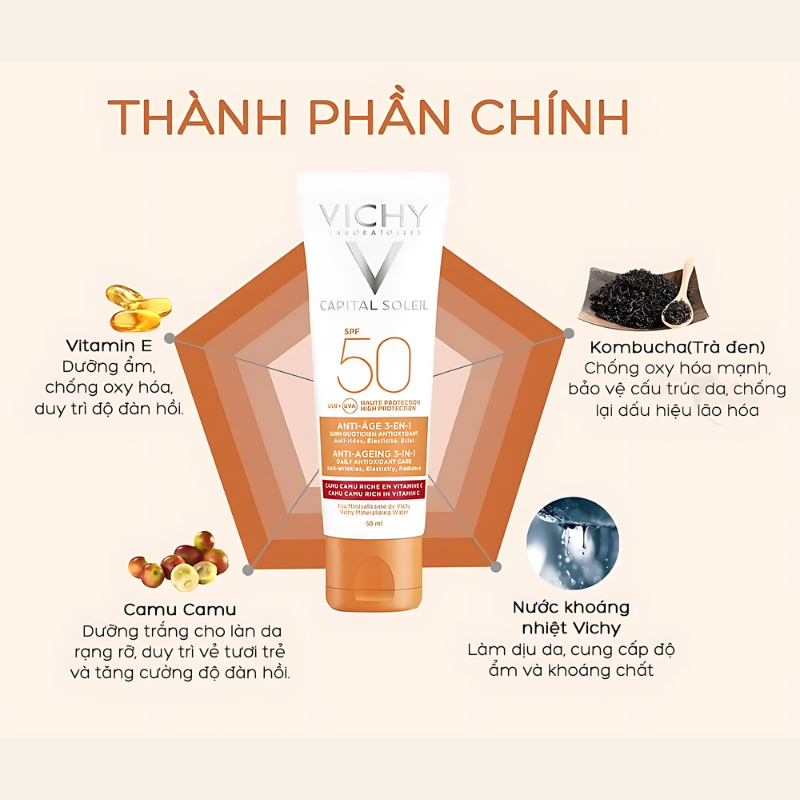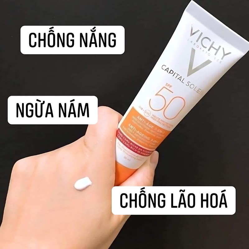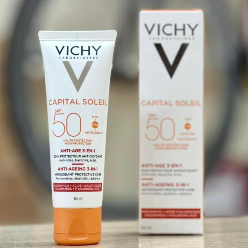 - Kem chống nắng Vichy Idéal Soleil Anti-Age với màng lọc UV tối ưu và chỉ số SPF 50, giúp bảo vệ da khỏi những tác động xấu từ ánh nắng mặt trời. Đặc trưng là công thức mới với chiết xuất trà đen và vitamin C đậm đặc từ Camu Camu, giúp làm giảm nếp nhăn, chống oxy hóa, mang lại làn da săn chắc và tươi sáng.