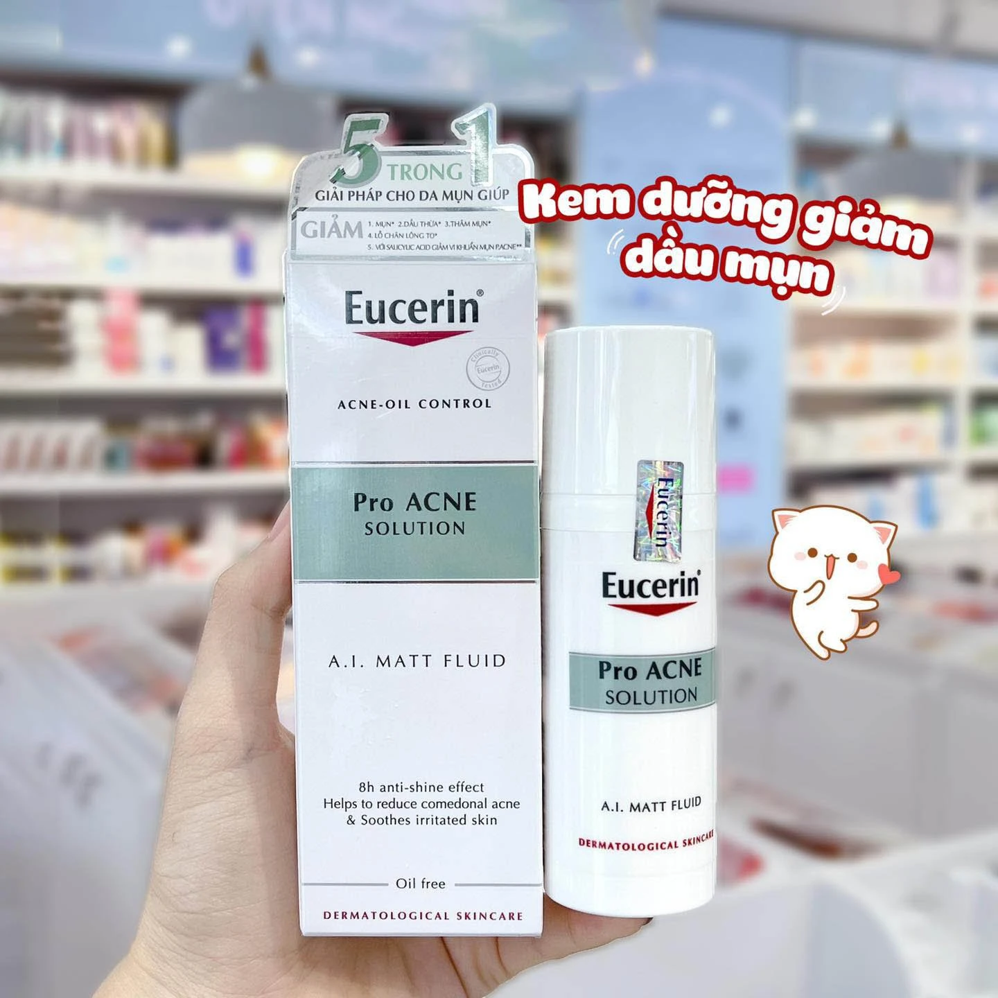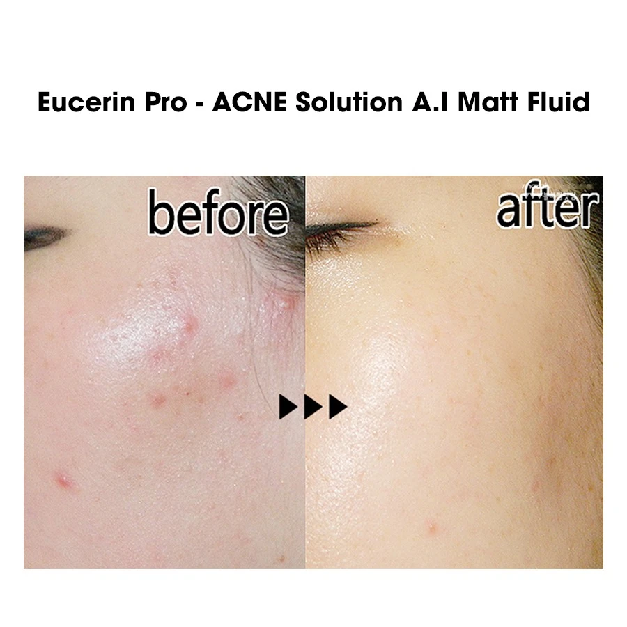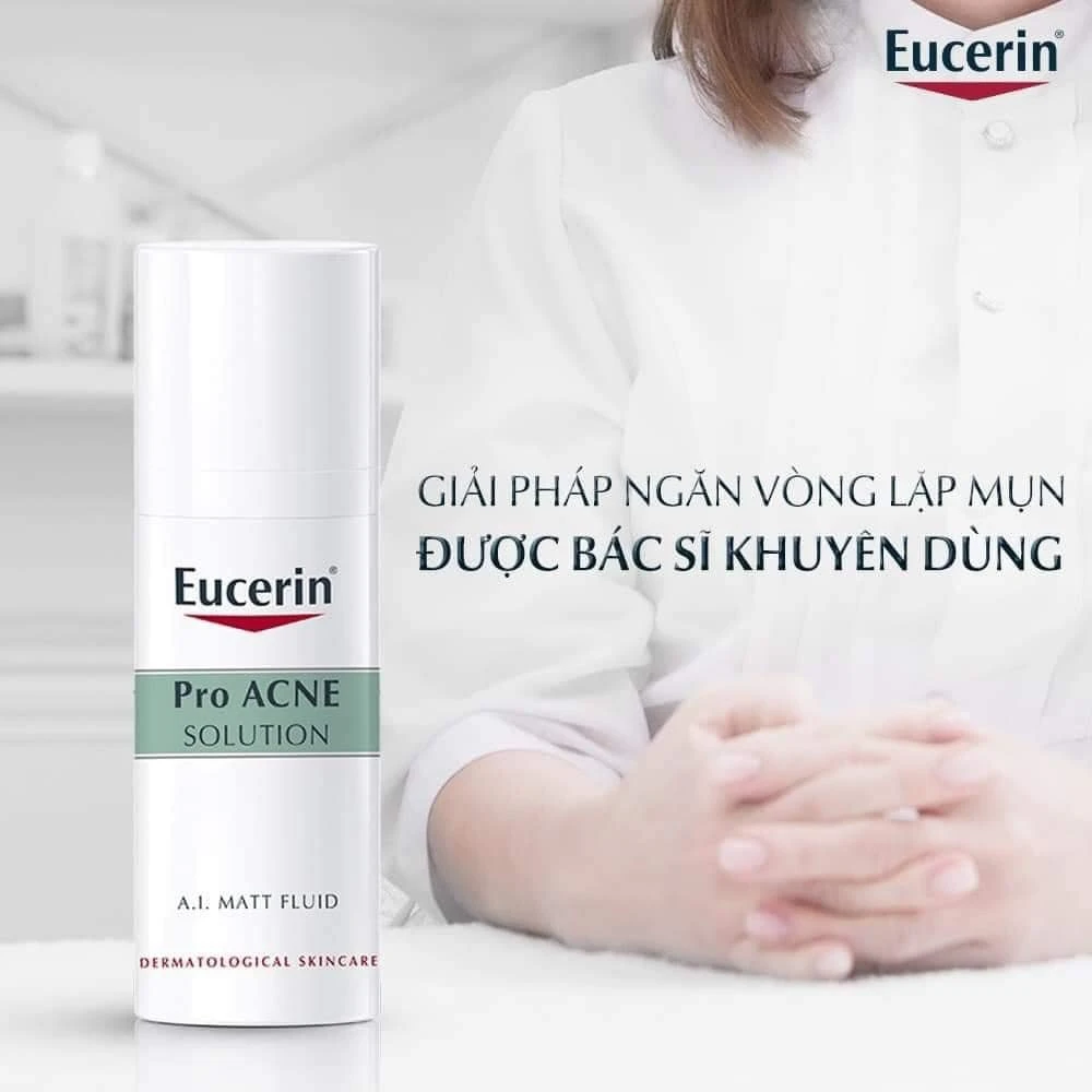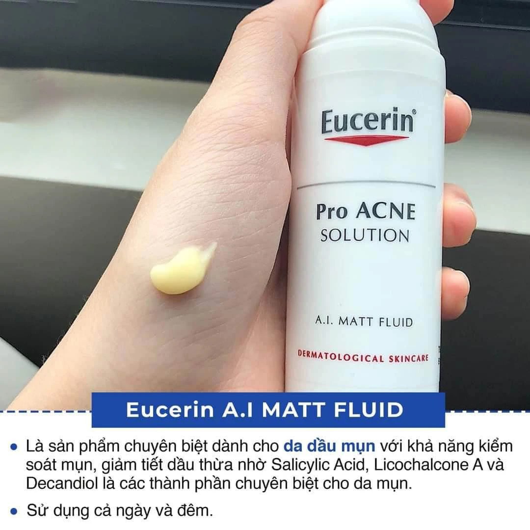 - Kem Dưỡng Eucerin ProAcne Solution A.I Matt Fluid giúp giảm đồng thời 5 vấn đề mụn thường gặp: Dầu thừa, vi khuẩn mụn, nốt mụn, thâm mụn và lỗ chân lông to. Từ đó, giúp ngừa mụn trở lại.