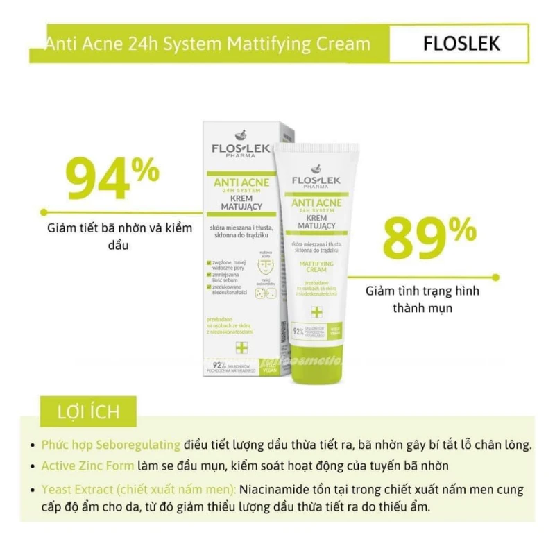 - Kem dưỡng Floslek Anti Acne Mattifying Cream sẽ tác động đến tuyến bã nhờn dưới da, ngăn không cho tiết quá nhiều dầu thừa, làm thông thoáng lỗ chân lông, ngăn ngừa mụn và các viêm nhiễm về da.