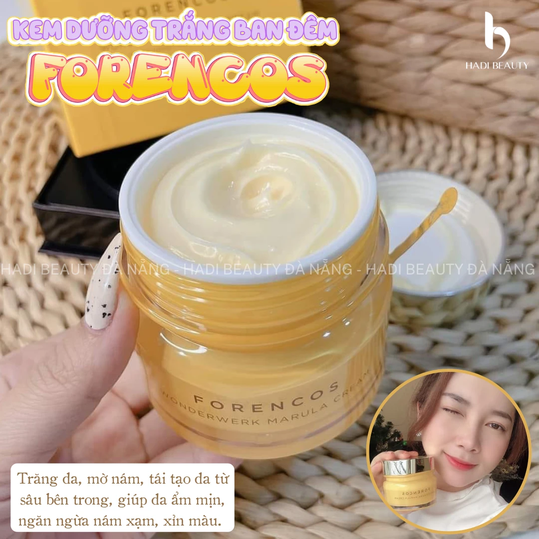 Kem Dưỡng Trắng Da Ban Đêm Forencos Wonderwerk Marula Cream Màu Vàng là sản phẩm thuộc thương hiệu Forencos đình đám tại Hàn Quốc. Chiết xuất chính từ dầu Marula và mật ong giúp bảo vệ da, hình thành hàng rào bảo vệ độ ẩm cho da. Cung cấp các dưỡng chất liên tục cho da. Các dưỡng chất này qua một đêm sẽ nhanh chóng thẩm thấu vào sâu bên trong mà không gây cảm giác bết dính. Giúp hồi phục làn da hư tổn nhanh chóng, giúp da ngày càng sáng lên và căng tràn sức trẻ……