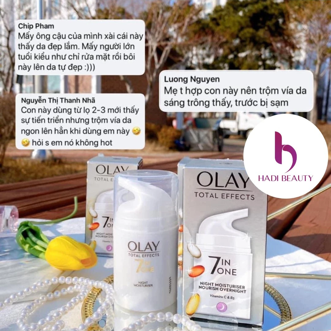 Kem dưỡng chống lão hóa Olay Total Effects 7 in One Night Cream có khả năng chống lại 7 dấu hiệu lão hóa với các công dụng như sau: Chống lão hóa và ngăn ngừa nếp nhăn hình thành. Chống oxy hóa, bảo vệ da khỏi các tác động xấu của môi trường. Cân bằng sắc tố da, ngăn ngừa xuất hiện các đốm nâu do tuổi tác. Dưỡng ẩm da, giúp bề mặt da trở nên láng mịn hơn. Làm sáng và đều màu da. Khôi phục độ săn chắc, giúp da đàn hồi và căng bóng. Se khít lỗ chân lông. Đặc biệt, sản phẩm mang đến hiệu quả rõ rệt chỉ sau 4 tuần sử dụng.