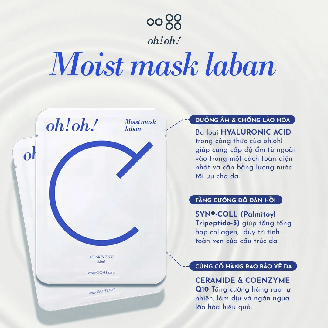 Oh!oh! Moist mask laban là dòng mặt nạ dưỡng ẩm chuyên sâu đặc biệt được thiết kế dành riêng cho làn da khô & mất nước. Công thức tiên tiến với các hoạt chất dưỡng ẩm đỉnh cao như 3 loại Hyaluronic Acid, Pentavitin® và Ceramide giúp nhanh chóng làm dịu vùng da đang khát nước, bổ sung độ ẩm tức thì và lâu dài lên đến 72 giờ.