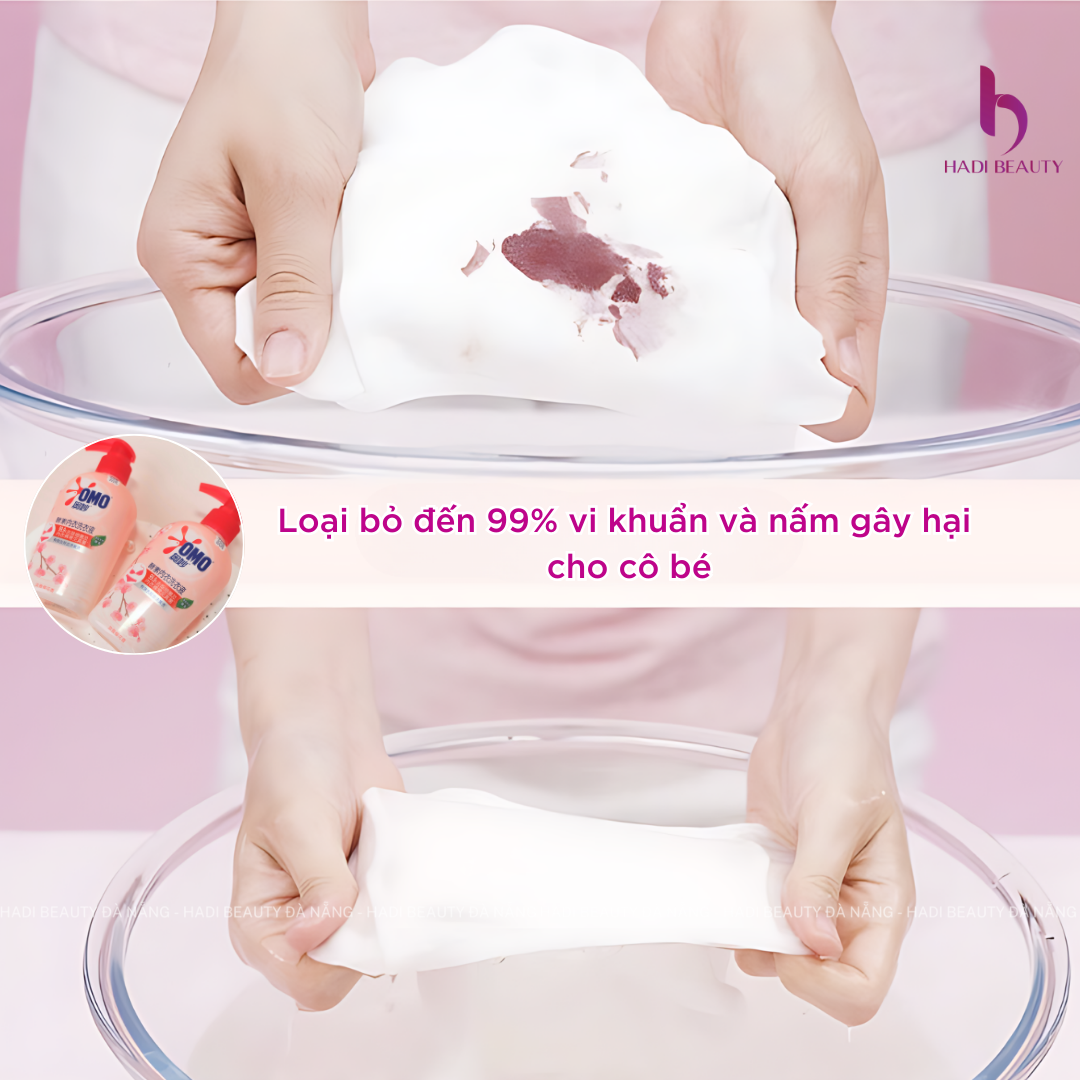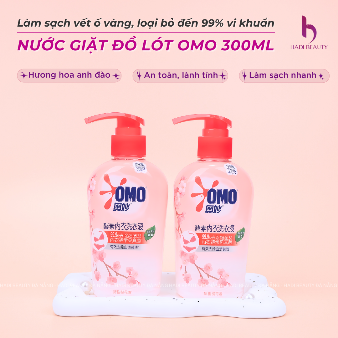 - Nước giặt đồ lót OMO là sản phẩm chuyên dùng để giặt đồ lót, làm sạch các vết ố vàng, loại bỏ đến 99% vi khuẩn và nấm gây bệnh cho cô bé
