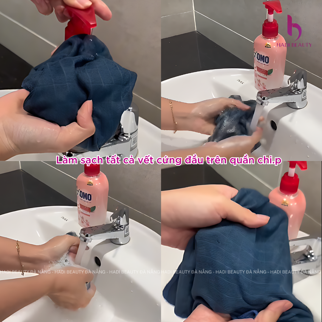 - Chỉ cần ngâm chiếc quần trong 5 phút rồi đem xả. Không cần dùng tay vò, không cần dùng bàn chải để chà xát mạnh