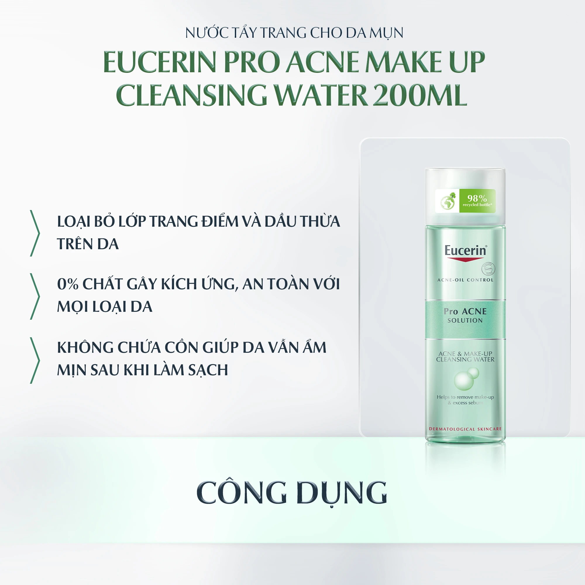 Nước Tẩy Trang Eucerin Pro Acne Solution Make Up Cleansing Water nằm trong dòng trị mụn, đặc biệt thích hợp dùng chung với các sản phẩm trị mụn được kê toa của bác sĩ, không những là sản phẩm làm sạch còn giúp bổ sung độ ẩm cho da, ngăn ngừa và giảm mụn hiệu quả. Đồng thời, sản phẩm giúp giảm mụn, se nhỏ lỗ chân lông.