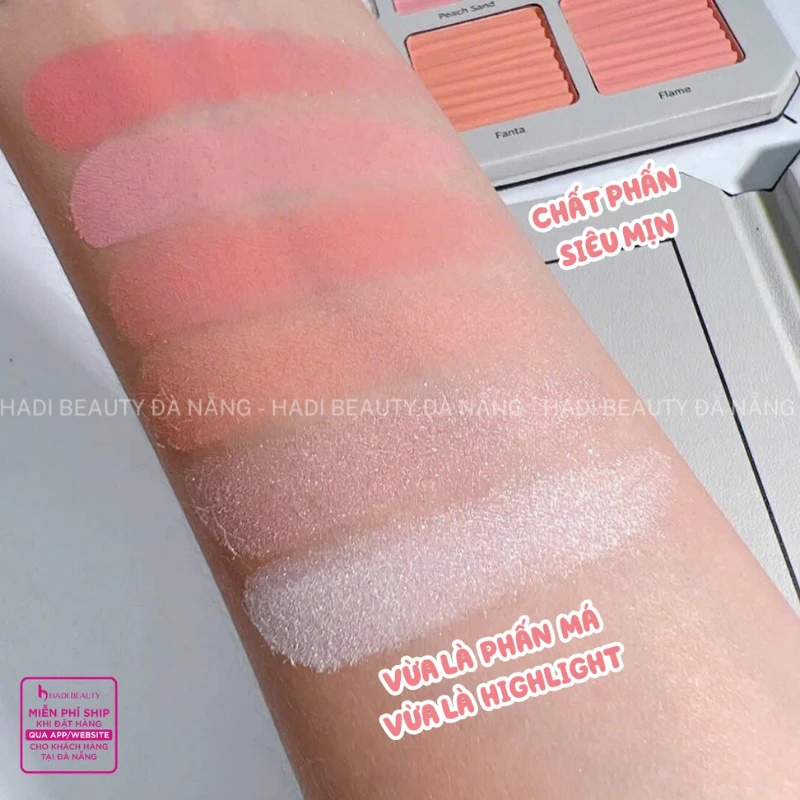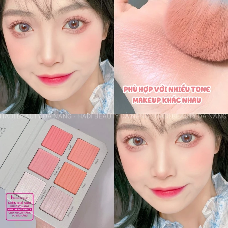 - Bao gồm: 4 tone má hồng matte dễ ứng dụng + 2 màu highlight bắt sáng.