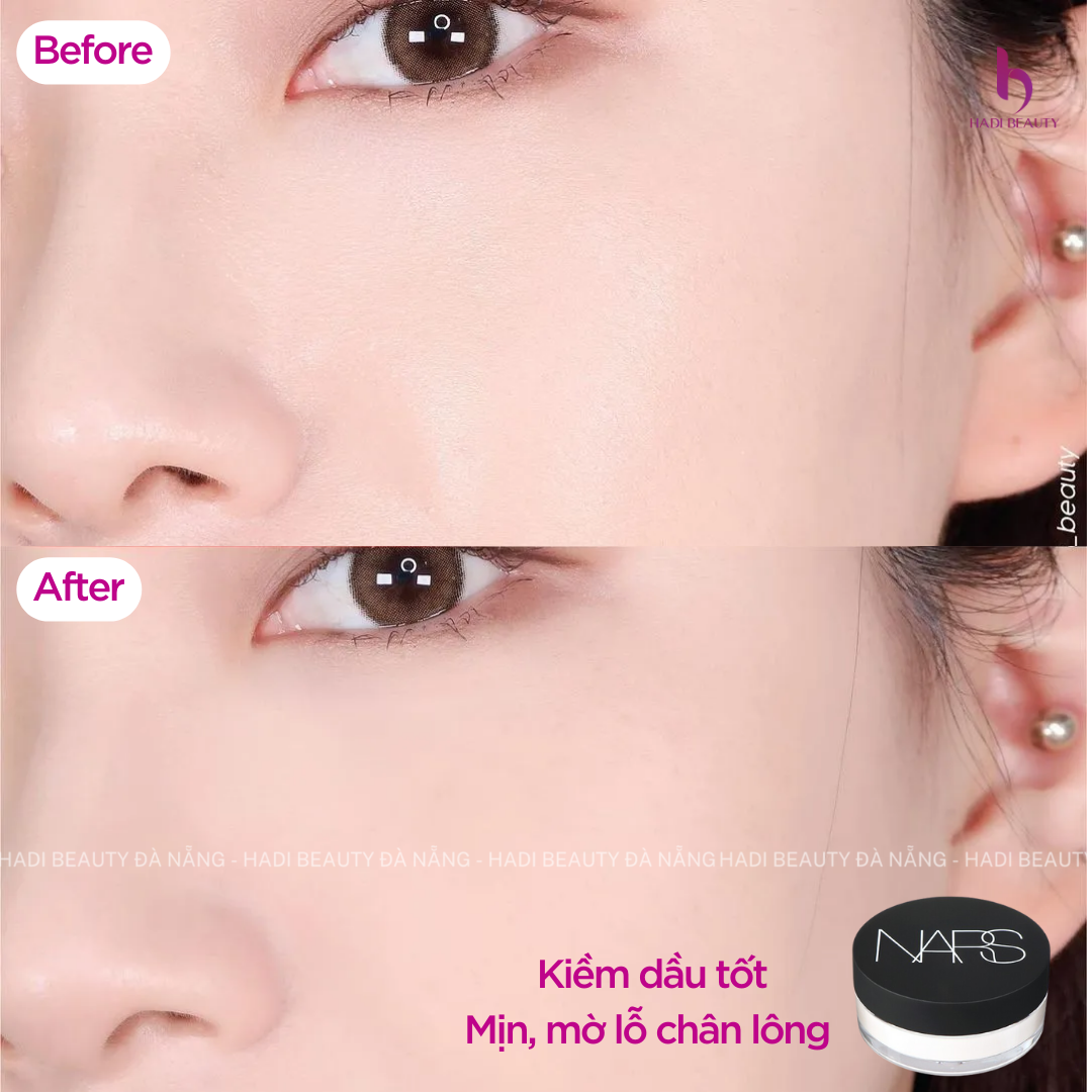 - Phấn có màu trắng, nhưng khi thoa lên da sẽ trở về trạng thái trong suốt không màu. - Đặc biệt, hộp phấn này sở hữu công thức kiềm dầu nhưng lại không gây cảm giác khô mốc, vẫn tạo được vẻ căng mịn tự nhiên cho da và làm mờ lỗ chân lông. - Điểm thú vị là những hạt phấn này khiến ánh sáng khi chiếu vào da được phản xạ lại ở mức thích hợp, da mặt vẫn sáng rạng rỡ nhưng không bị bóng lóa. - Phấn phủ của NARS có khả năng giữ lớp trang điểm không trôi cả ngày, thấm hút dầu thừa tốt và còn làm mờ các nếp nhăn trên khuôn mặt.