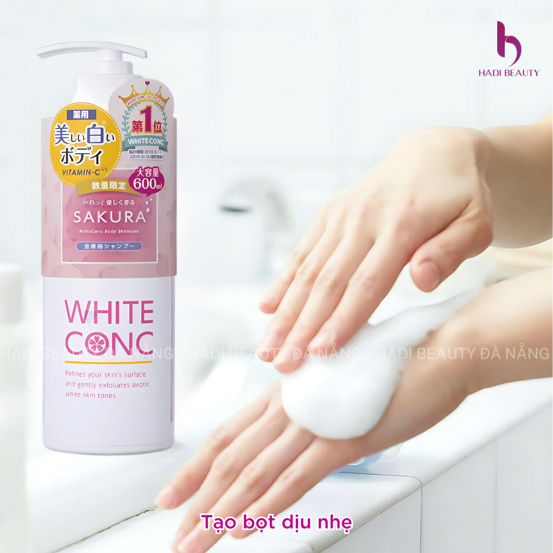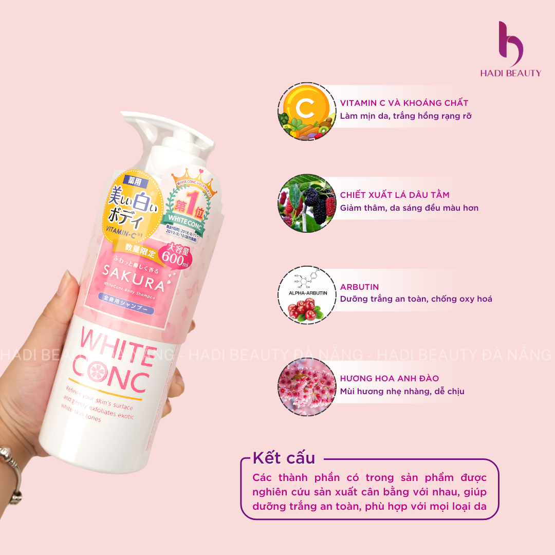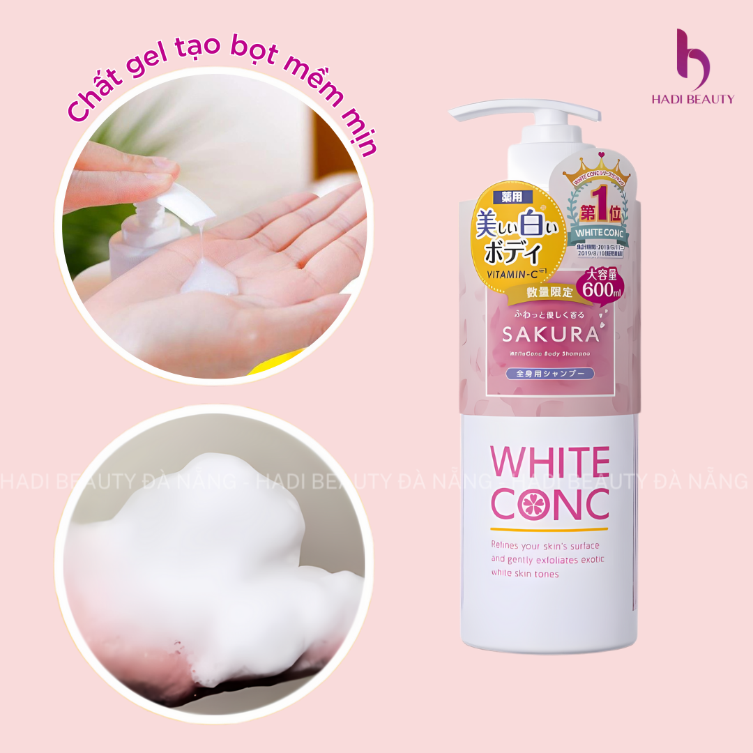 Sữa tắm trắng da, mờ thâm sạm White Conc Sakura phiên bản mới hương hoa anh đào chuyên dưỡng trắng, cấp ẩm, làm mờ các khuyết điểm, thâm sạm trên da giúp da luôn tươi trẻ, trắng hồng rạng rỡ.