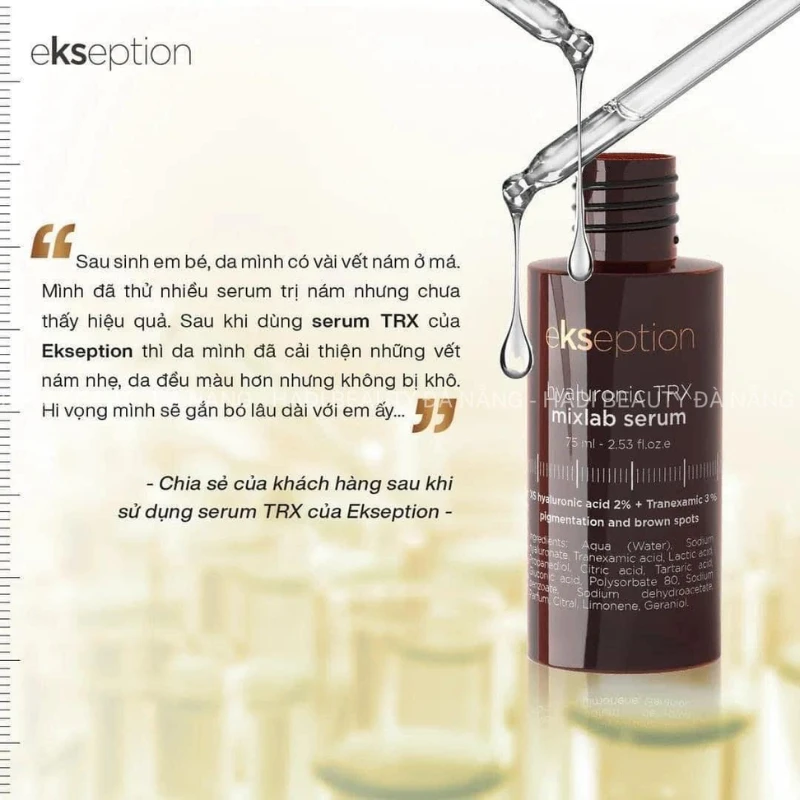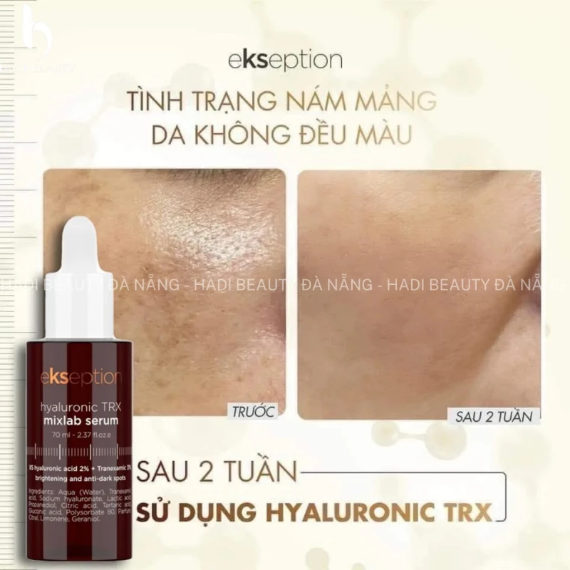 - Serum Ekseption Hyaluronic TRX với công dụng làm sáng da, giảm sắc tố và các đốm đen nhờ vào thành phần chính là Tranexamic acid. Hoạt chất này ngăn chặn sự kích hoạt của các tế bào hắc tố từ tia cực tím (UV) và tế bào sừng bị tổn thương thông qua việc ức chế hệ thống hoạt động plasminogen, làm giảm hoạt động của men enzyme Tyrosinase từ đó ngăn chặn quá trình khởi tạo sắc tố melanin, phục hồi hàng rào bảo vệ da cũng như cải thiện những vấn đề sắc tố trên da nhanh chóng.