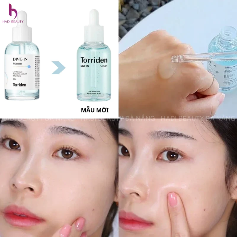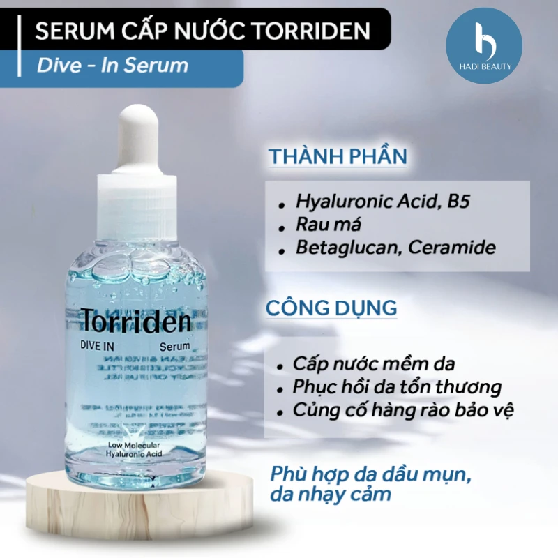 - Tinh Chất Torriden Dive In Low Molecular Hyaluronic Acid Serum là một loại serum cấp nước, giữ ẩm sâu với các phân tử siêu nhỏ cùng phức hợp Hyaluronic Acid 5D (là 5 loại HA) đảm bảo thấm sâu vào tầng trung bì và hạ bì, cấp nước cho da căng mềm, đủ ẩm, hạn chế tình trạng khô mốc hay đổ dầu quá nhiều.