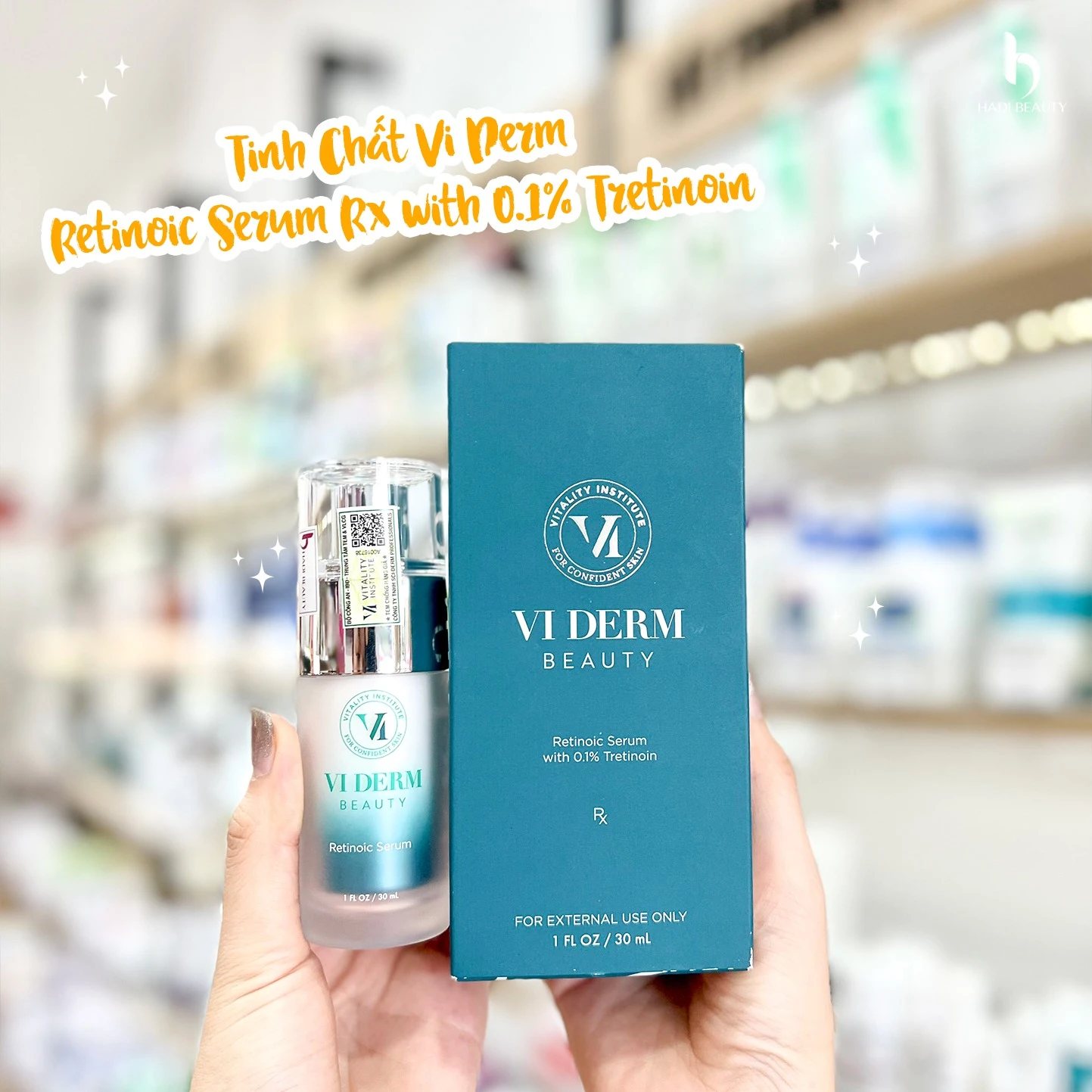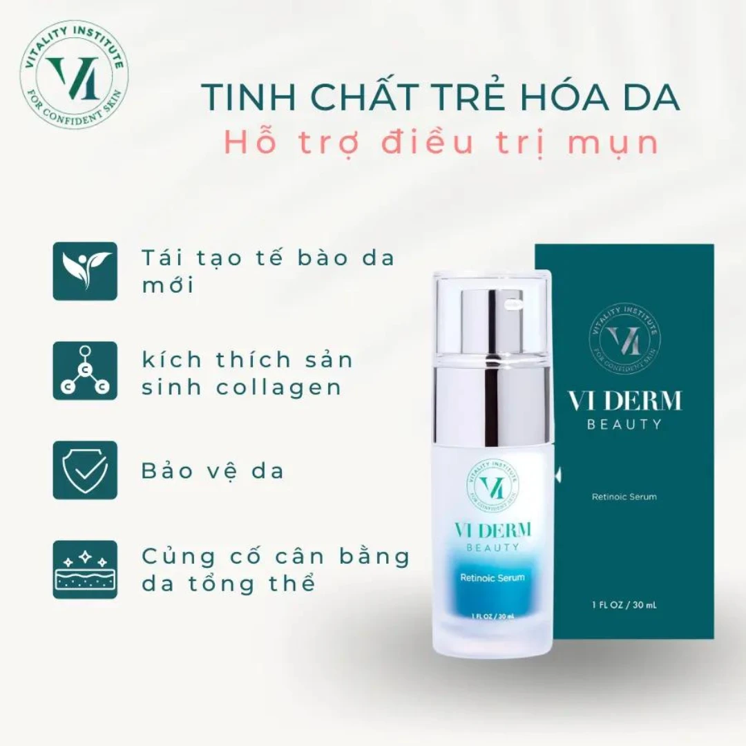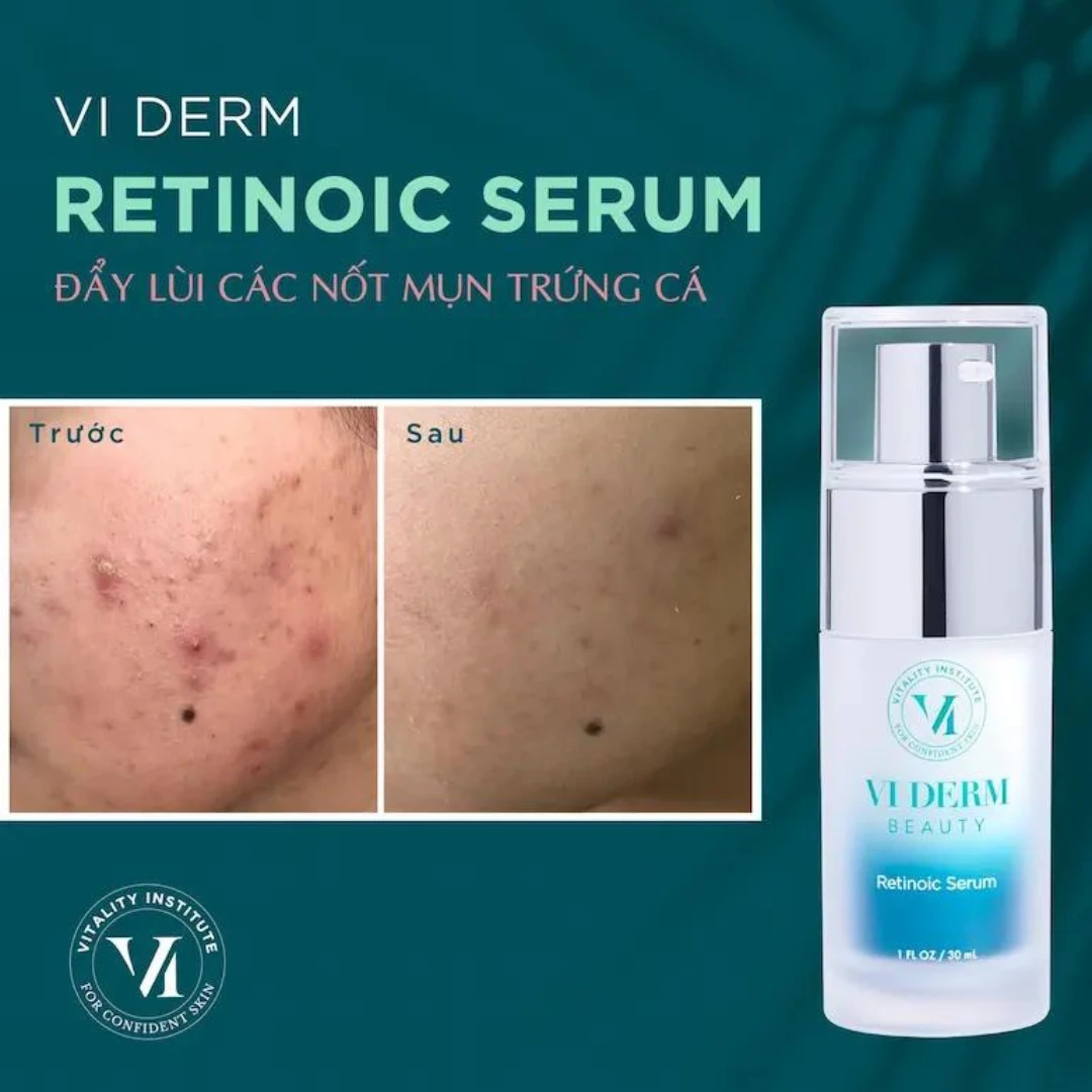 - Serum trị mụn VI Derm Retinoic Serum với công thức tiên tiến chứa Axit Retinoic duy nhất trên thị trường. Serum chứa Retinol, một thành phần chống lão hóa và giúp giảm sự hình thành mụn hiệu quả. Đồng thời, các thành phần dưỡng ẩm và làm dịu cùng với Retinol giúp giữ cho da mềm mại và không bị khô căng sau khi sử dụng.